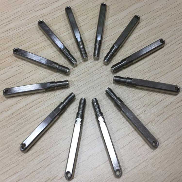 兩端同時(shí)銑扁加工,再一端鉆一個(gè)孔或兩個(gè)孔,同時(shí)倒角加工,最后攻牙加工一次性完成。